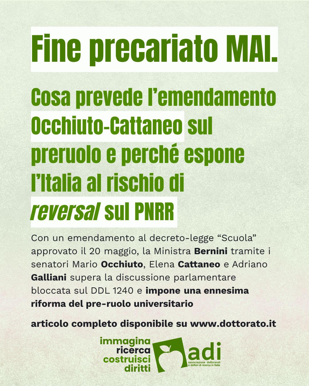 Per questo motivo, come ADI, ci troviamo di nuovo nella necessità di valutare, alla luce del testo approvato al Senato del DL Scuola, i possibili rischi non solo di reversal della riforma, in virtù del possibile aggiramento della milestone PNRR sulla carriera dei ricercatori, ma anche in generale di infrazione della normativa europea, dalla Carta Europea dei Ricercatori alla Direttiva (UE) 2024/1499, del 7 maggio 2024 sulla parità di trattamento economico.
