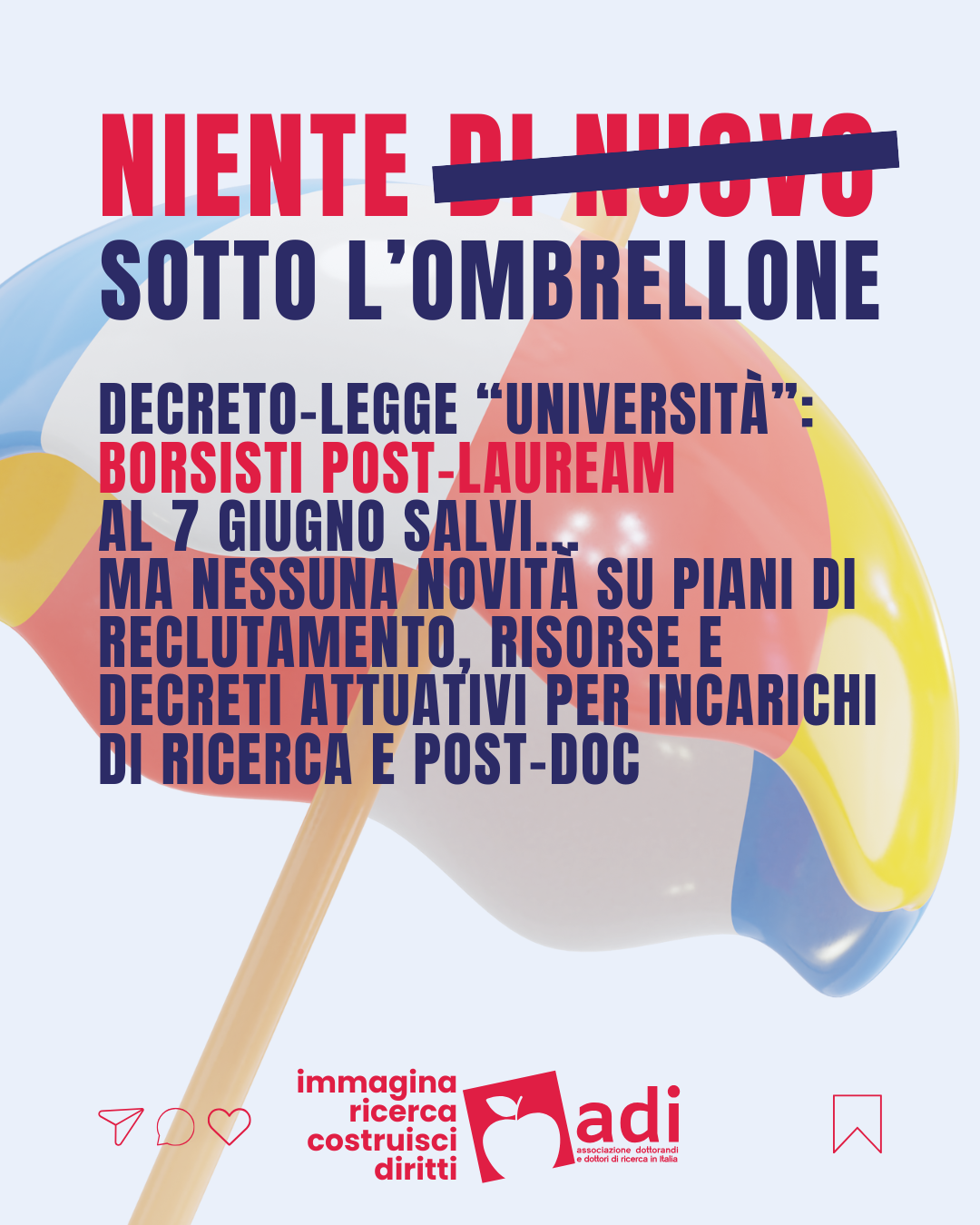 Siamo di fronte a un atto normativo privo di visione, che non risponde alle necessità reali del sistema universitario, né alla condizione delle decine di migliaia di precari e precarie della ricerca. Ancora una volta, sotto l’ombrellone non c’è nulla di nuovo: solo incertezze, rinvii e omissioni che rischiano di danneggiare il sistema nel suo complesso.