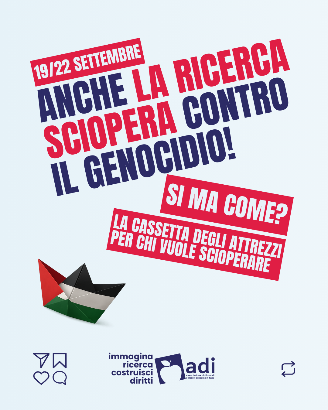 Rights are earned by exercising them: even the right to strike is built through strikes. Therefore, as ADI, we invite everyone to join the days of protest alongside workers throughout Italy and to reaffirm, together, that research stands with Palestine. To make our category's participation concrete, we propose our toolbox, made up of collective practices and gestures that allow us to truly experience these days of strike action.